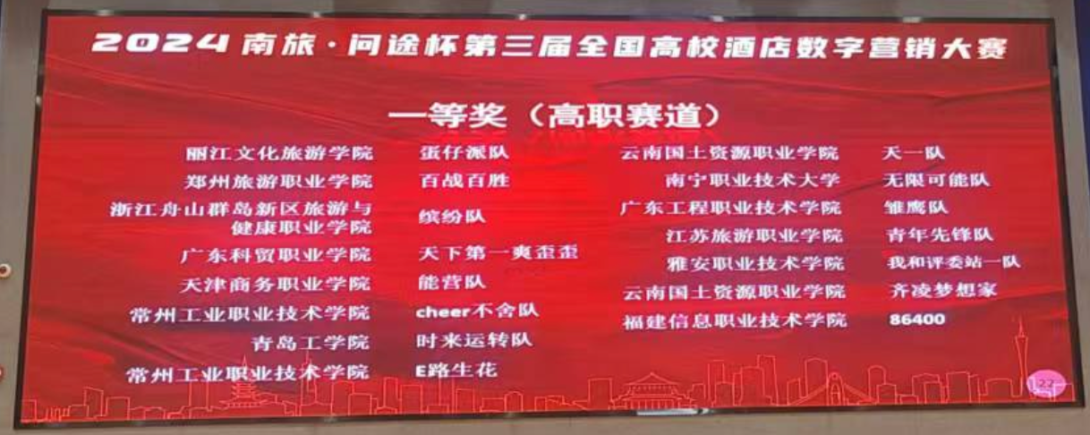 12月7日,“南旅·问途杯”第三届全国高校酒店数字营销大赛圆满落下帷幕。比赛紧密围绕产业数字化转型需求和酒店数字营销工作场景设计竞赛内容和任务,融入了最新的数字化技术和人工智能多模态AIGC技术。经过激烈角逐,来自我校酒店管理与数字化运营专业的三支参赛队伍脱颖而出,取得可喜的成绩。其中,天一队(队员:代雪芬、赵燕青、苏云丽、张贵华)和齐凌梦想家队(队员:蒲璇宇、左顺玉、李天玲、陆蓉)凭借出色的团队协作与创新思维,成功摘得全国一等奖的桂冠;奋进之星队(队员:黄丽、刁冬梅、石火喷、李思懿)荣获全国三等奖的好成绩。
